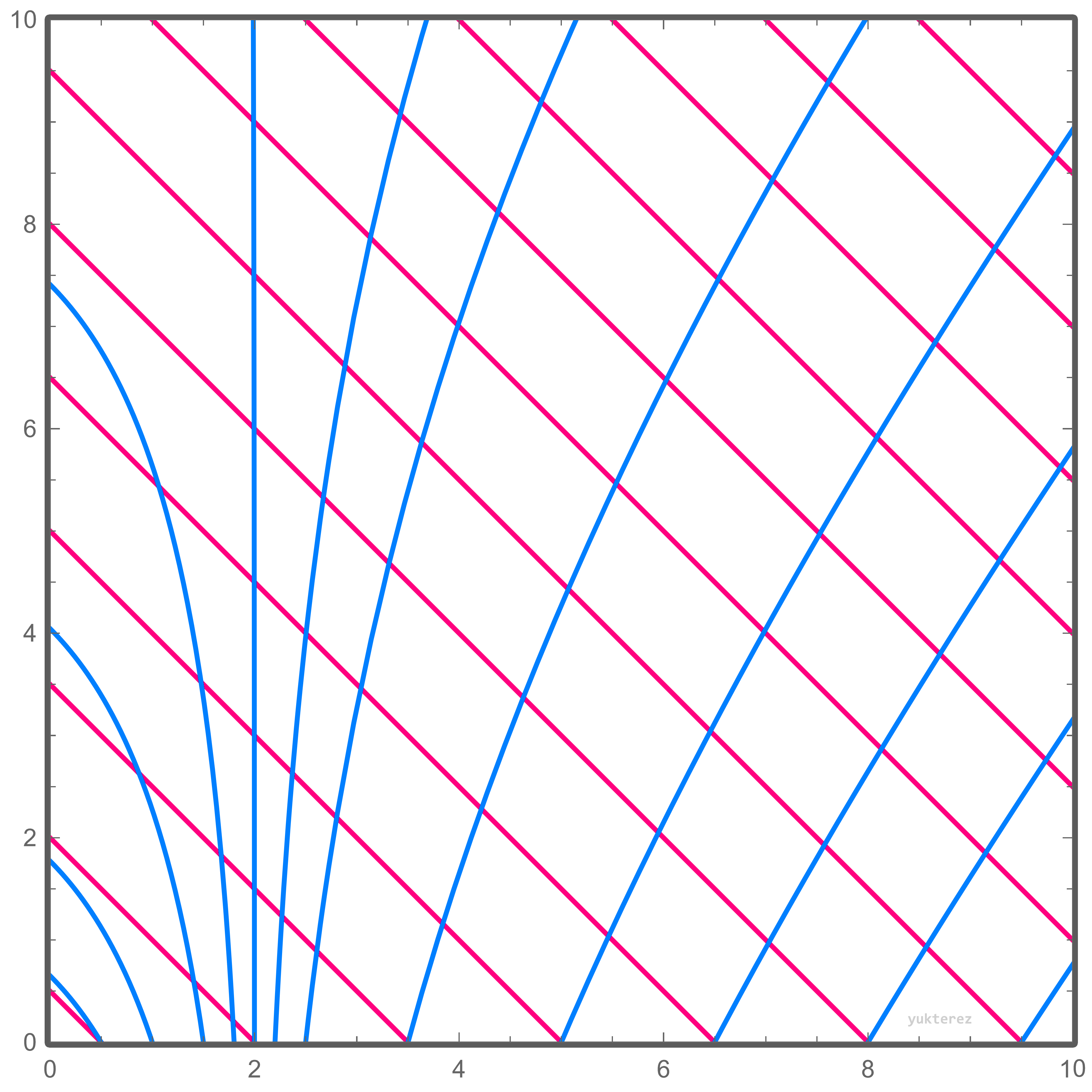 Eddington Finkelstein Koordinaten, Weltlinien von Photonen. x=r, y=t, G=M=c=1